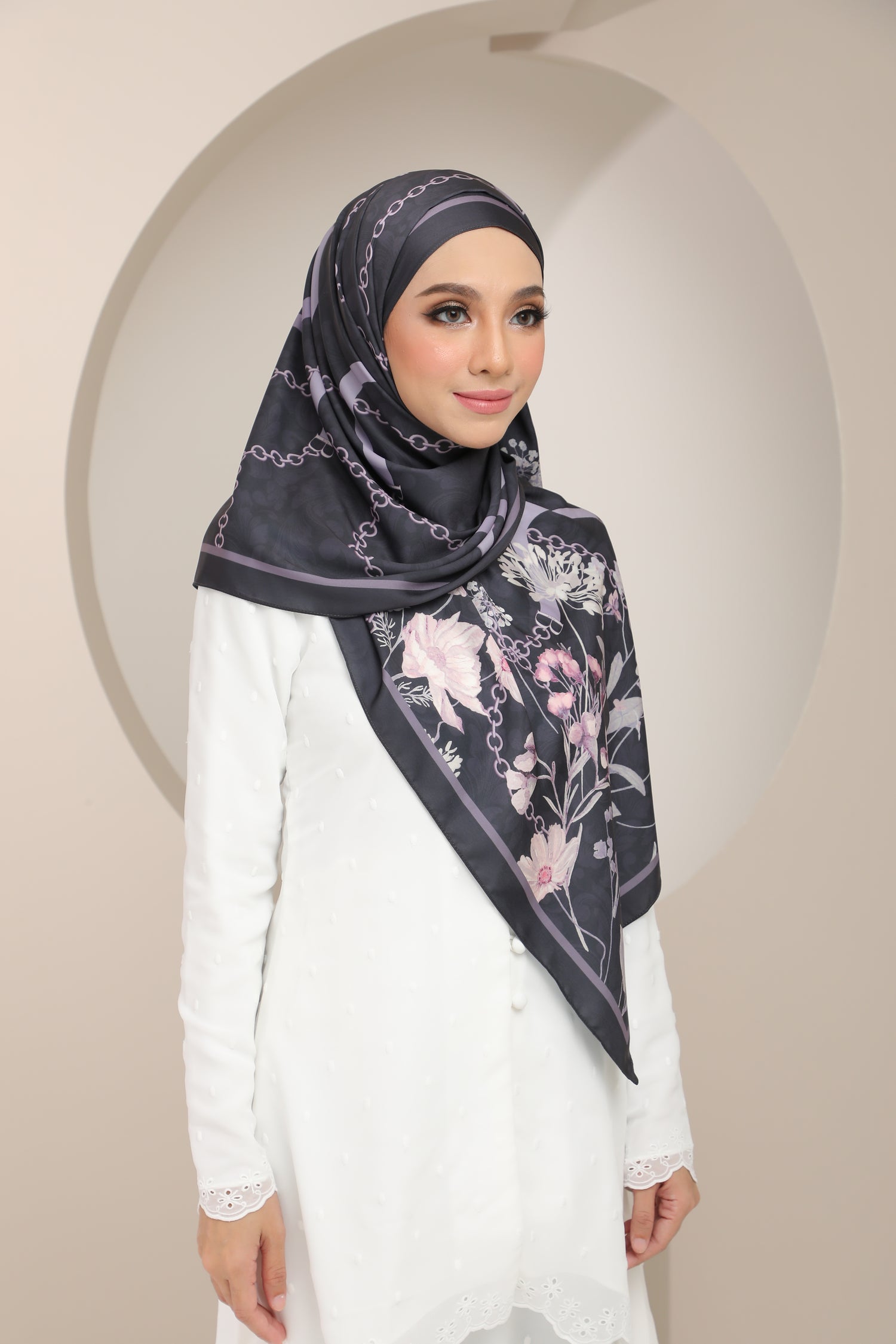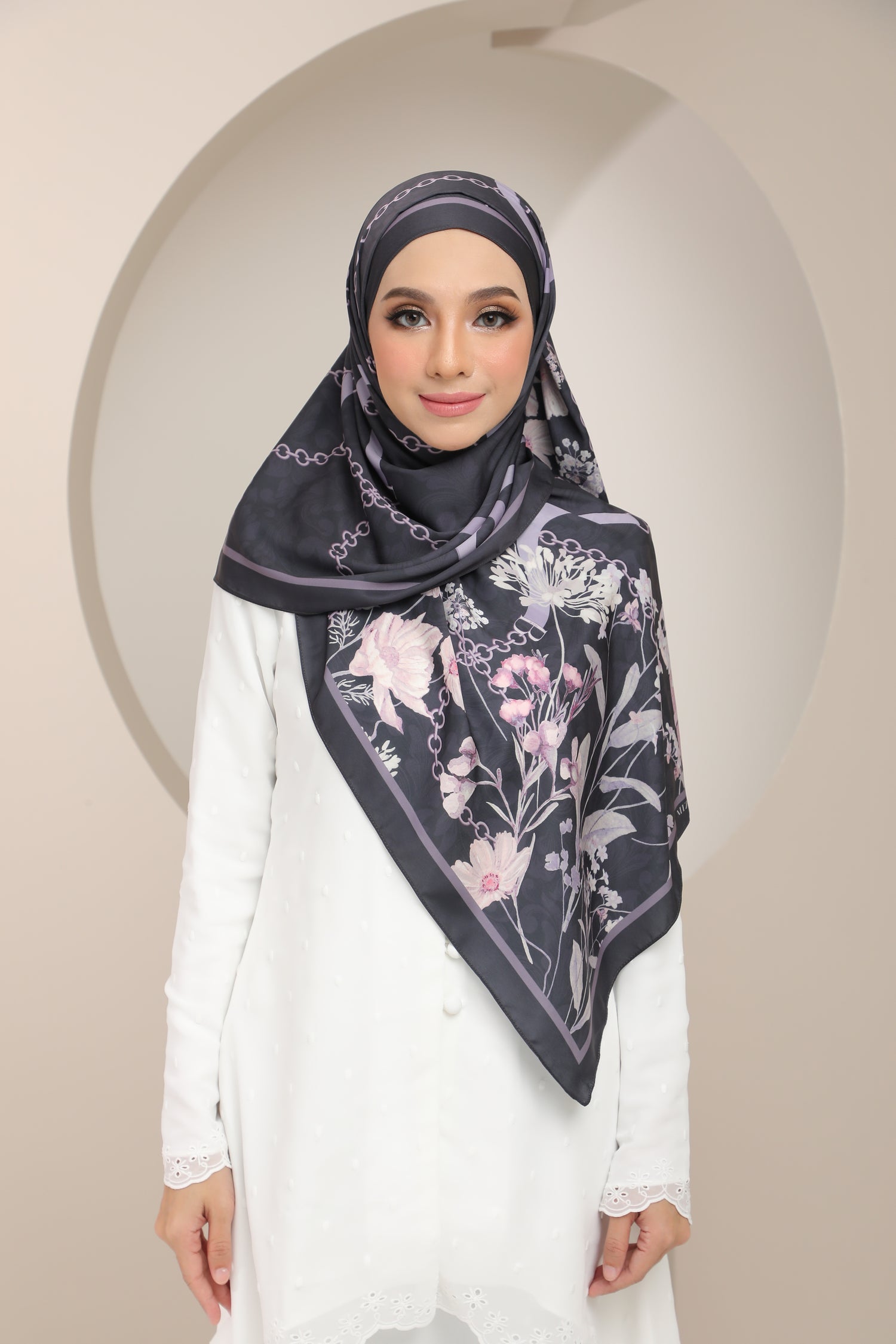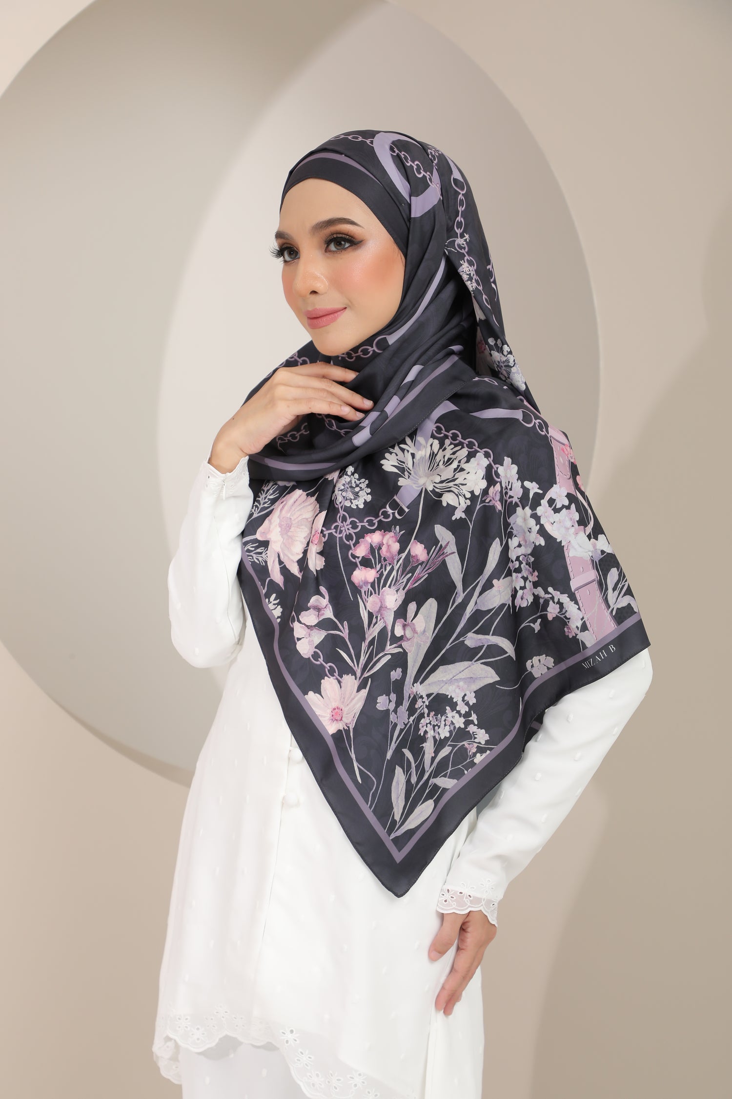 Chaîne Des Fleurs collection. Chain of Flowers in French, the collection exudes classic European style but in a more subtle chic kind of way, with beautiful watercolour flowers adorning the scarf, entwined with chained leather belts with a special detail - see if you can spot the B for Mizah B.
